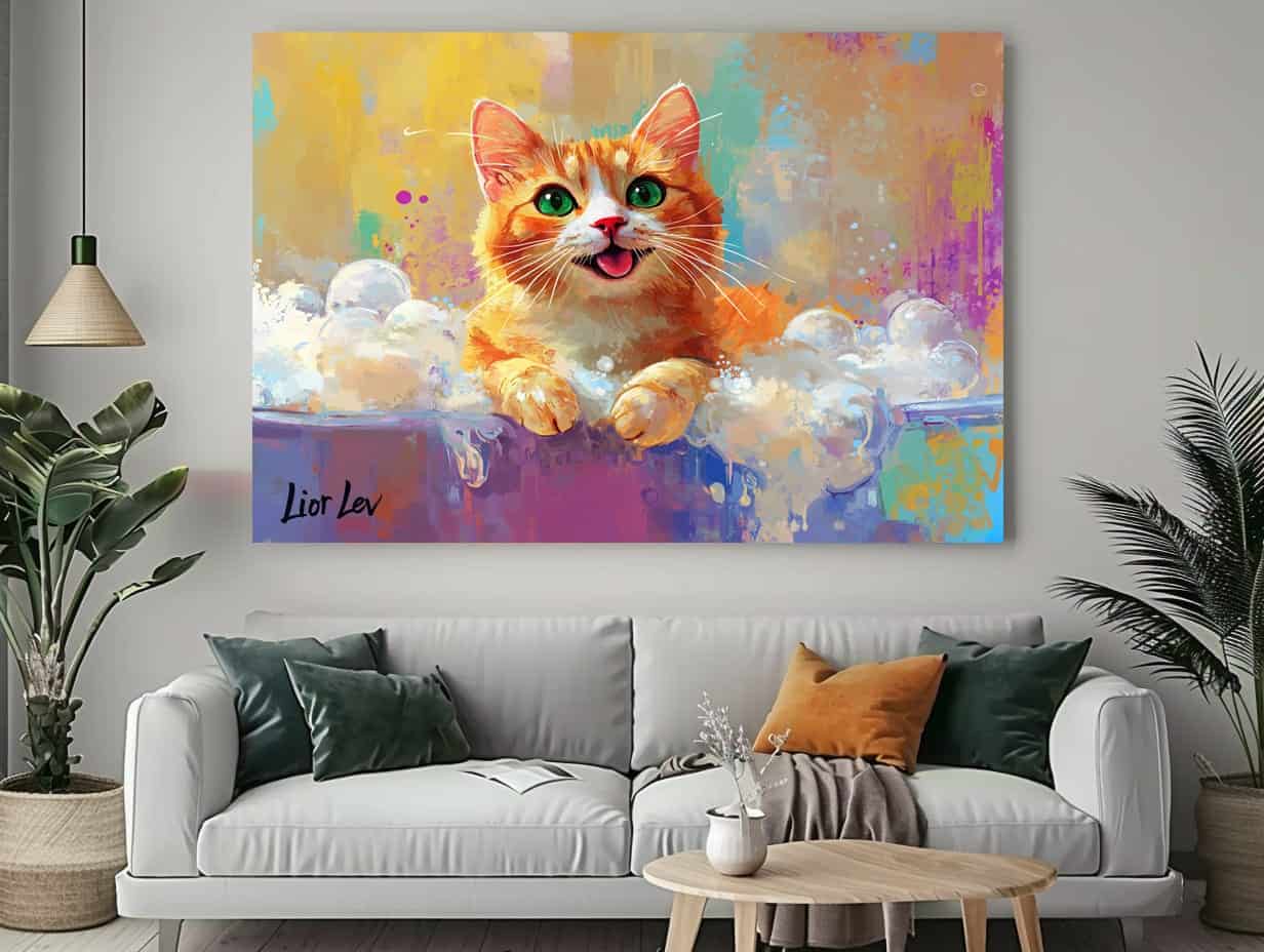הדפס מקורי על קנבס של חתול באמבטיית קצף.