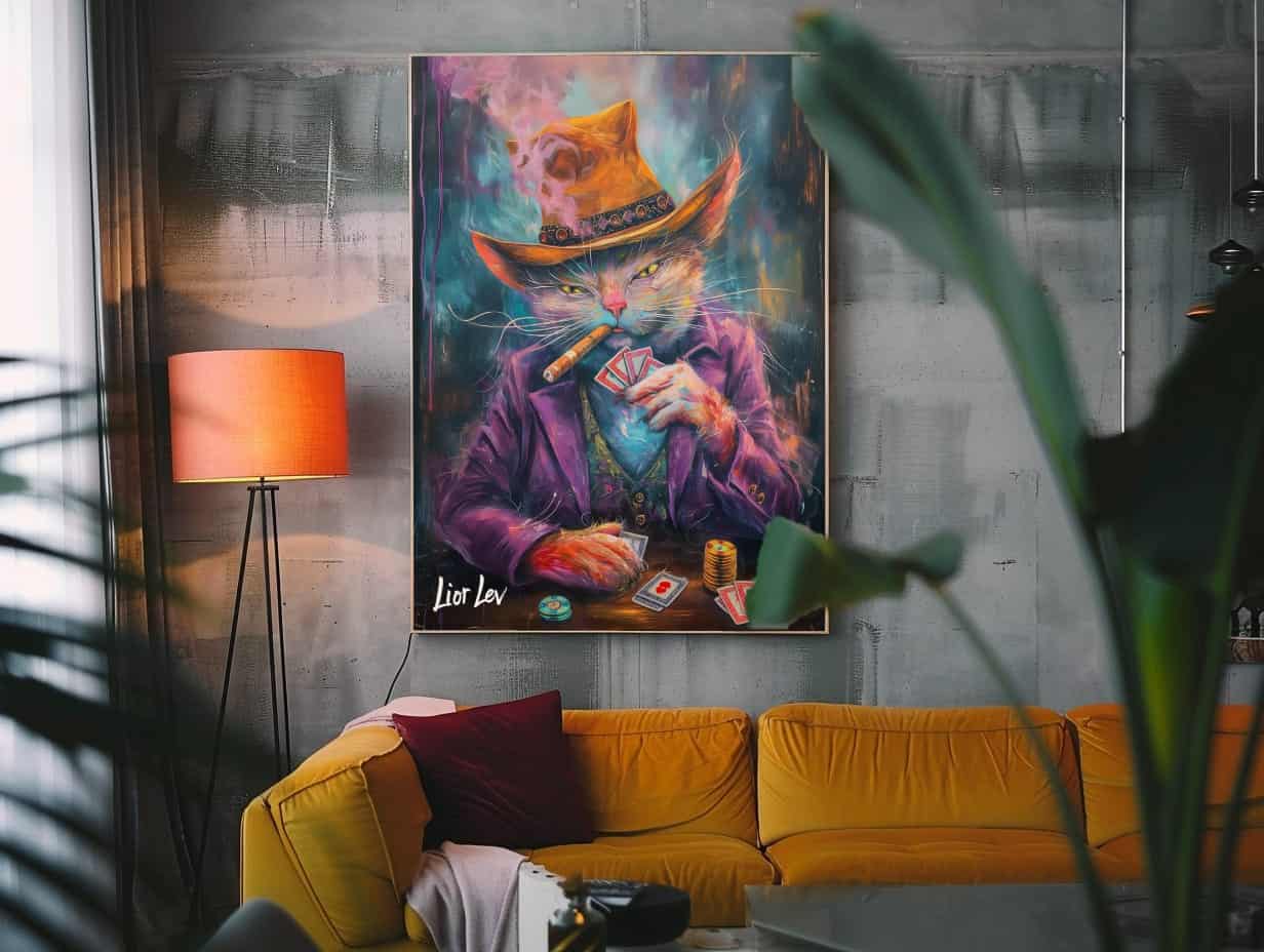 הדפס מקורי על קנבס של חחתול משחק קלפים.