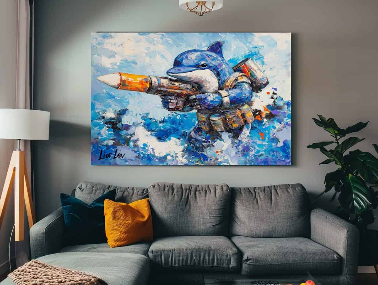 הדפס מקורי על קנבס של דולפין מחזיק משגר טילים.
