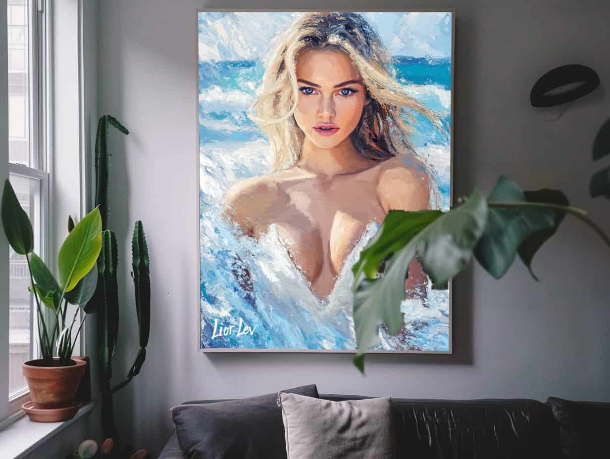 הדפס מקורי על קנבס של נימפת ים לובשת את קצף הגלים בתור שמלה.