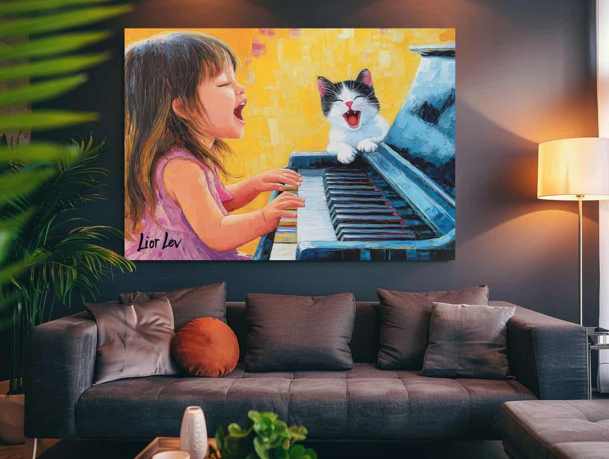 הדפס מקורי על קנבס של ילדה מנגנת על פסנתר ושרה, וחתולה שרה ביחד איתה.