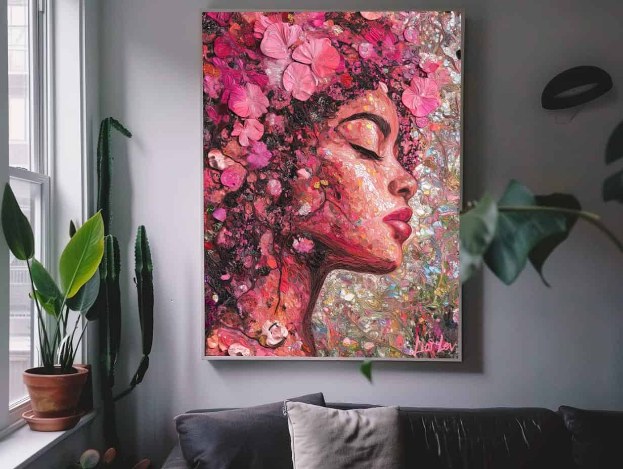 הדפס מקורי על קנבס של דיוקן של אישה בפרחים.